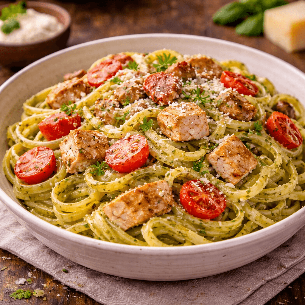 🌿🍝 Pasta Piletina PestoSočna piletina i savršeno kuvana pasta u aromatičnom pesto sosu sa parmezanom – lagana, ali bogata kombinacija ukusa koja osvaja na prvi zalogaj.