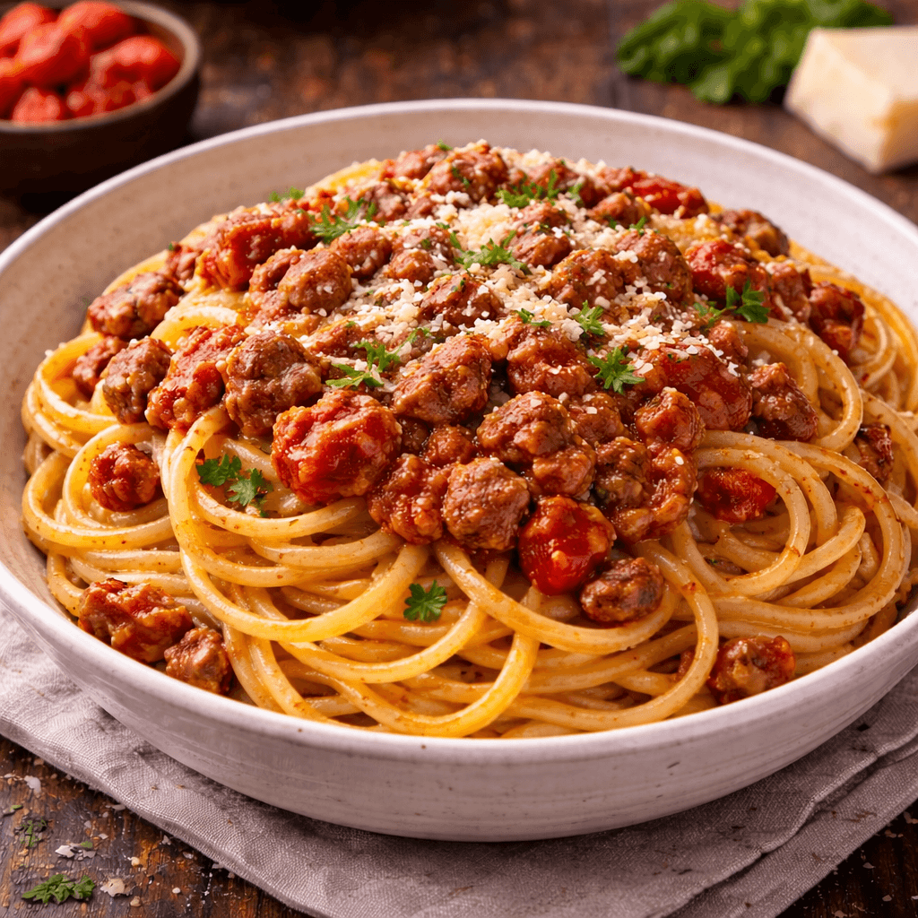 🍝 Pasta BolonjezeSočna pasta u bogatom paradajz sosu sa mlevenim mesom i začinima – klasičan recept koji daje pun i domaći ukus u svakom zalogaju.