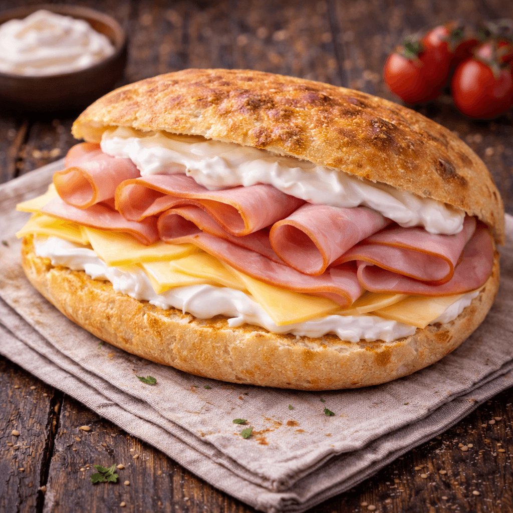 🥪 Đački sendvičJednostavan, ali omiljen – kombinacija šunke, kačkavalja i kremaste pavlake u toplom hlebu za brz, ukusan i zasitan zalogaj.