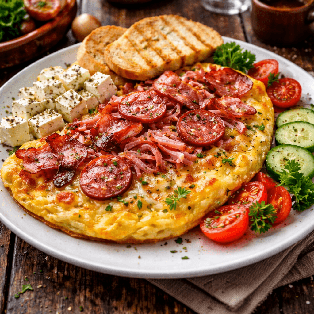 🍳 Omlet sa šunkom, kulenom, slaninom i feta siromSočan omlet pun bogatih ukusa – šunka, kulen, hrskava slanina i kremasti feta sir za savršen početak dana.