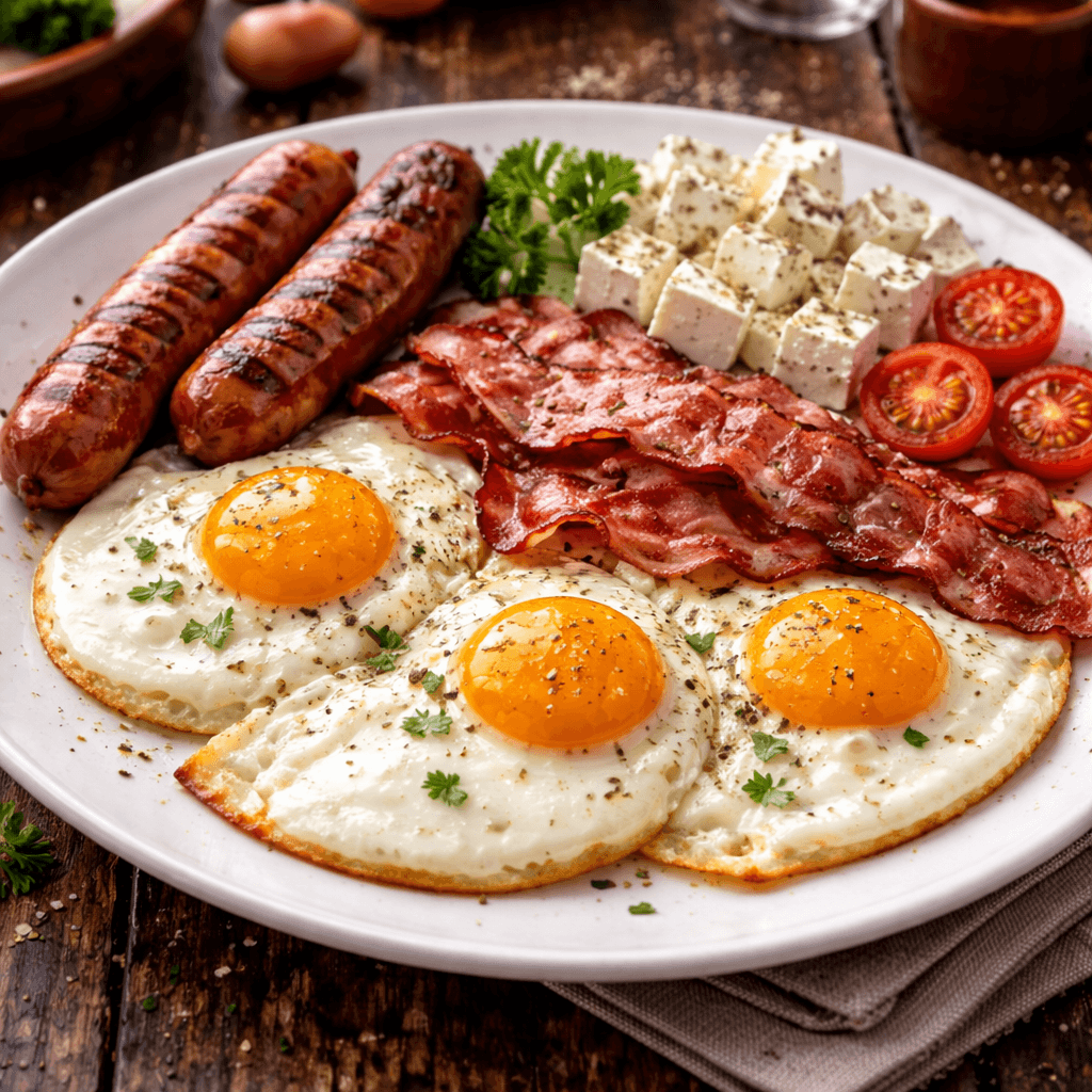 🍳 3 jaja na oko sa kobasicom, slaninom i feta siromTri savršeno pečena jaja na oko uz sočnu kobasicu, hrskavu slaninu i kremasti feta sir – doručak koji zasiti i daje energiju za ceo dan.
