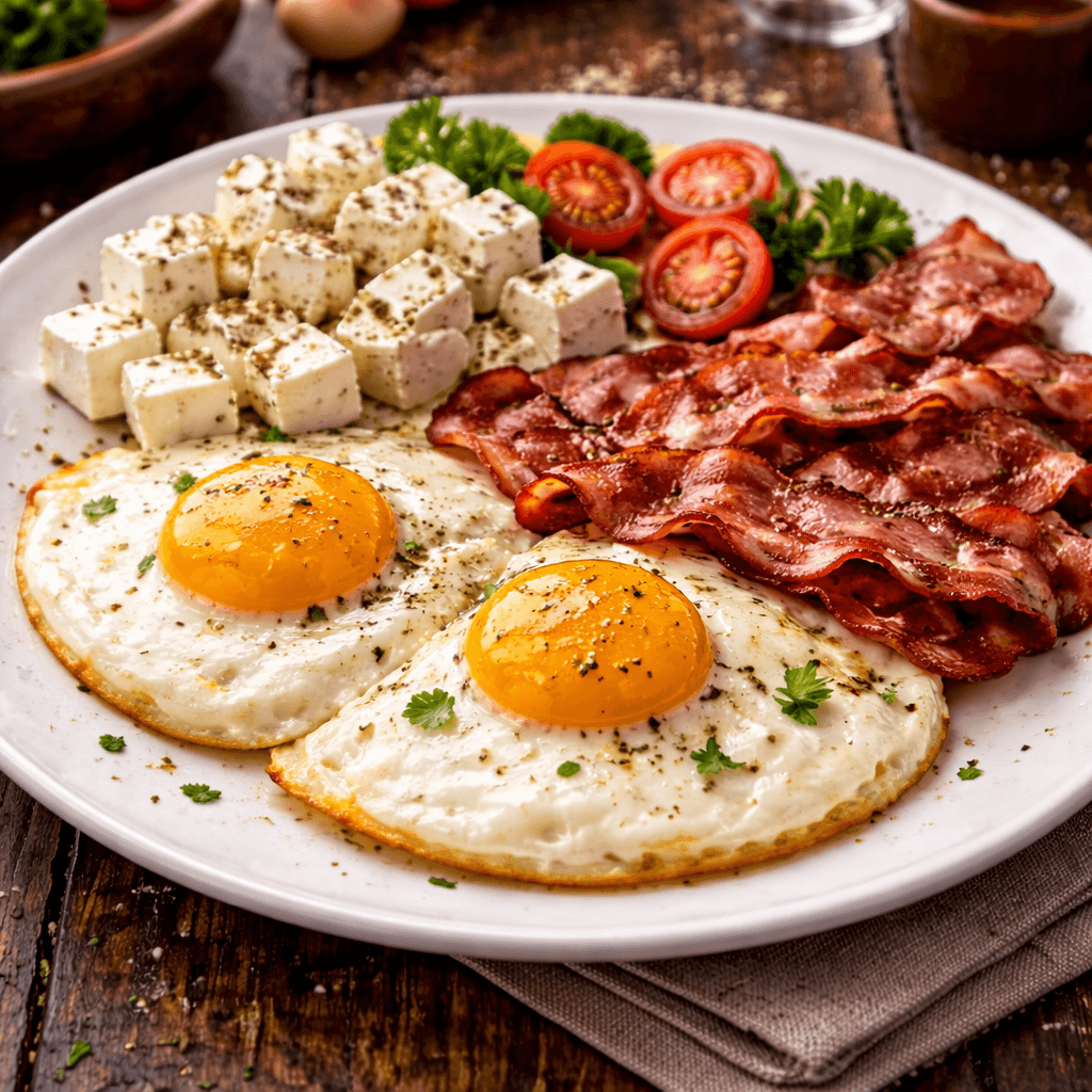 🍳 Dva jaja na oko sa slaninom i feta siromSavršeno pečena jaja na oko uz hrskavu slaninu i kremasti feta sir – jednostavan, ali pun ukus doručka koji daje energiju za dobar početak dana.