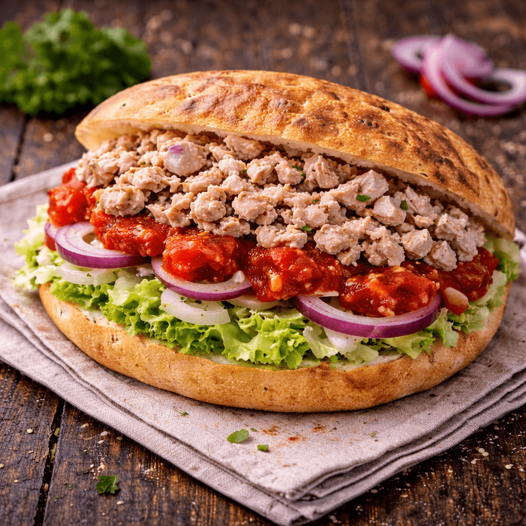🥗🥪 Posni sendvičSveža kombinacija tune, luka, iceberg salate i pelata u toplom hlebu – lagan, ali pun ukusa sendvič koji savršeno osvežava i zasiti.