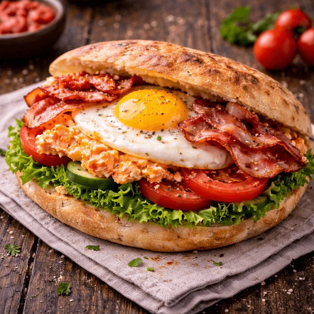🥪 Srpski sendvičSočna kombinacija urnebesa, hrskave slanine, sveže pečenog jajeta, zelene salate i paradajza u toplom hlebu – pravi domaći zalogaj pun ukusa.